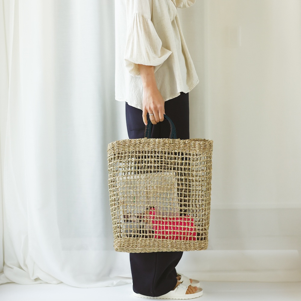ベトナム・ハノイ。人々の生活の中に当たり前にあるカゴを、トートバッグの形に落とし込みました。使用しているのは シ ー グ ラ ス( 水 草 )。