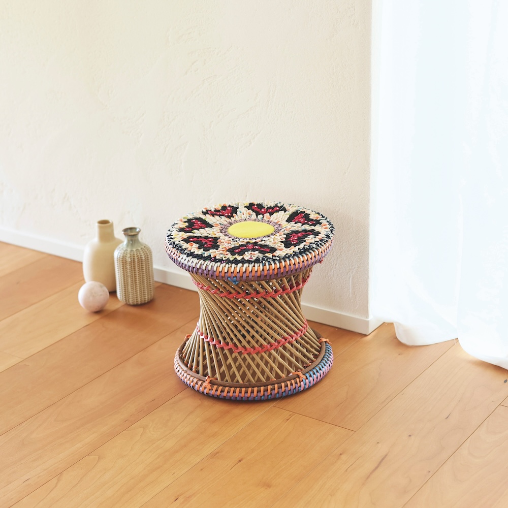座面の細かな編み目 と、中心の流れるようなラインのバンブーが 組み合わさりスツールとなりました。