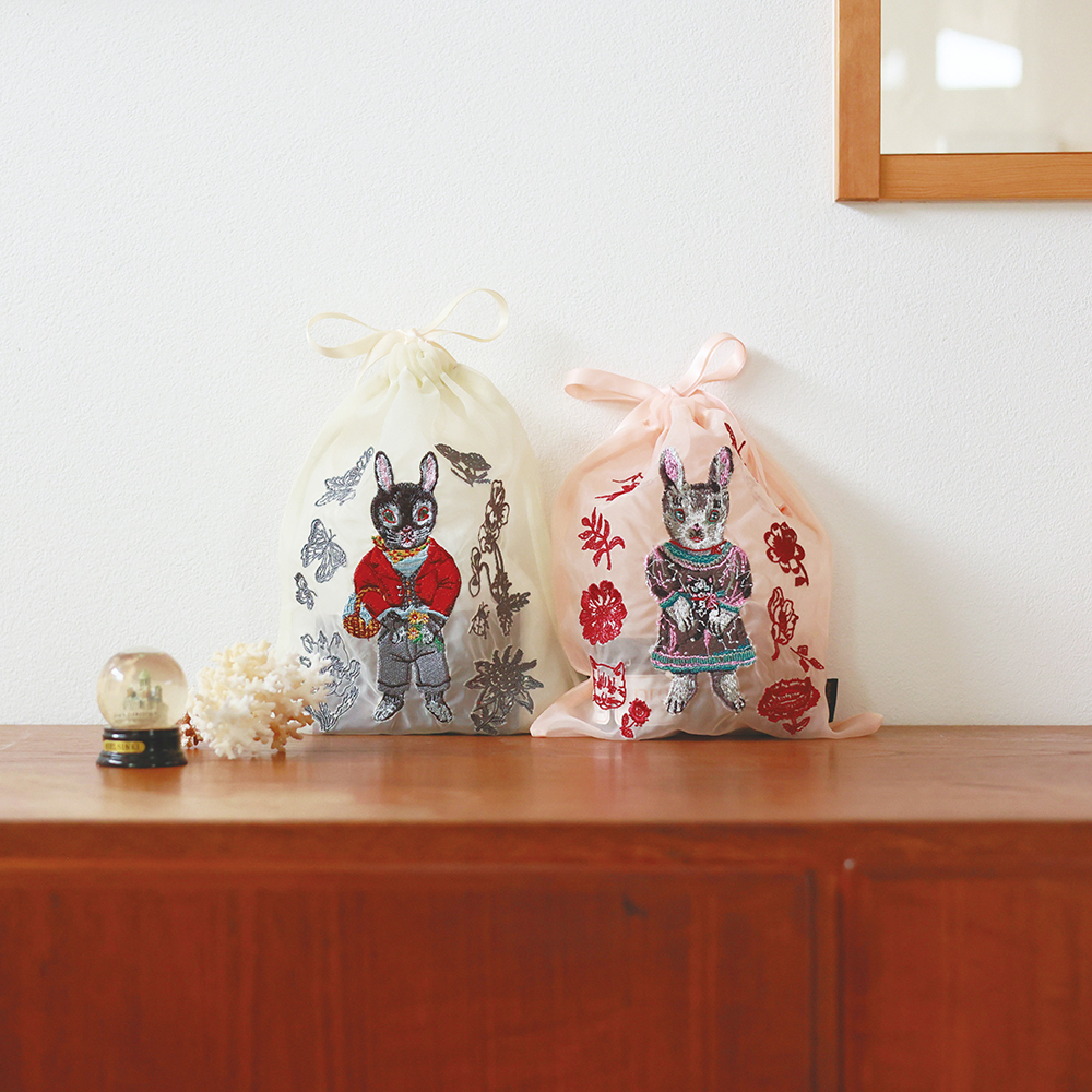ナタリー・レテのイラストを贅沢に刺繍で表現したオーガンジー素材の巾着に、新しい仲間が登場です。