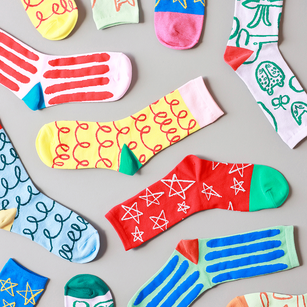 Gomaさんが描く、ポップながら手描きの温かさが伝わるデザインをモチーフにしたソックスです。